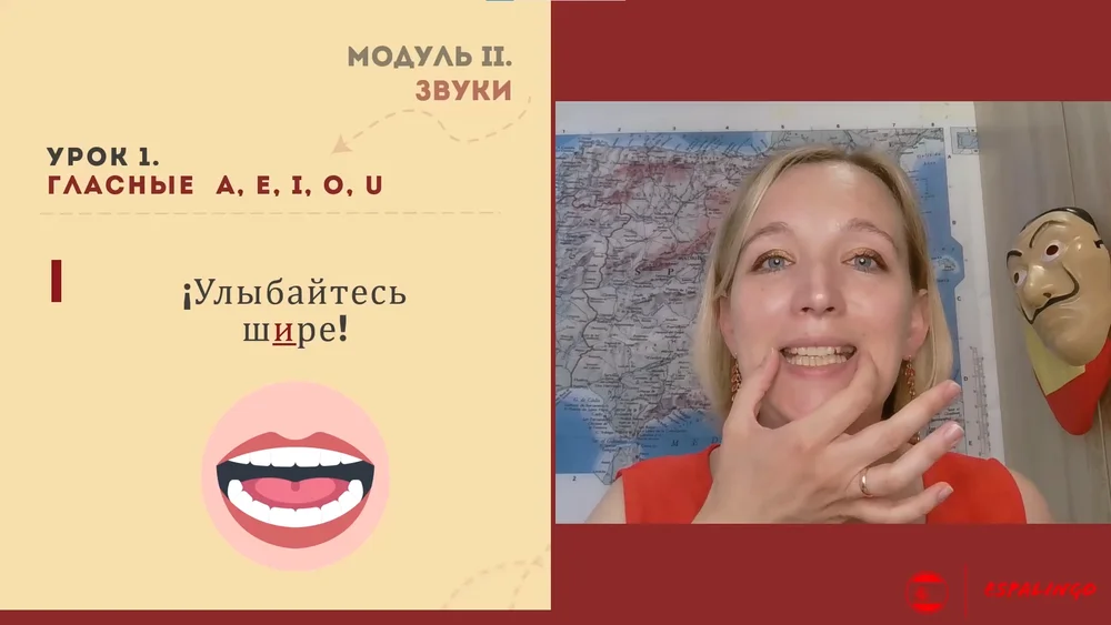 Например, курс по произношению — это: теория «без воды» → практические задания → проверка куратора. Отрабатываем отдельно каждый из 27 звуков, ритм и интонацию на оригинале сериала «Бумажный дом».